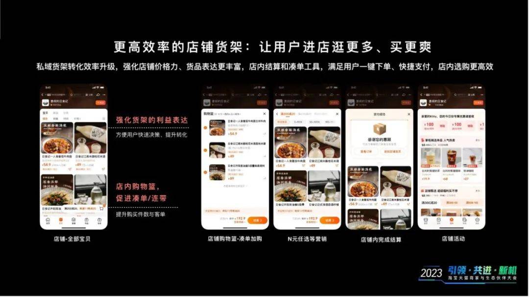 淘宝天猫在打造整个中国电商场景最高效的店铺货架体系,首次在店铺内提供购物篮,与公域购物车不一样,店铺下可以允许店内私域凑单、满减,甚至在店铺里面做各类玩法的核心能力。