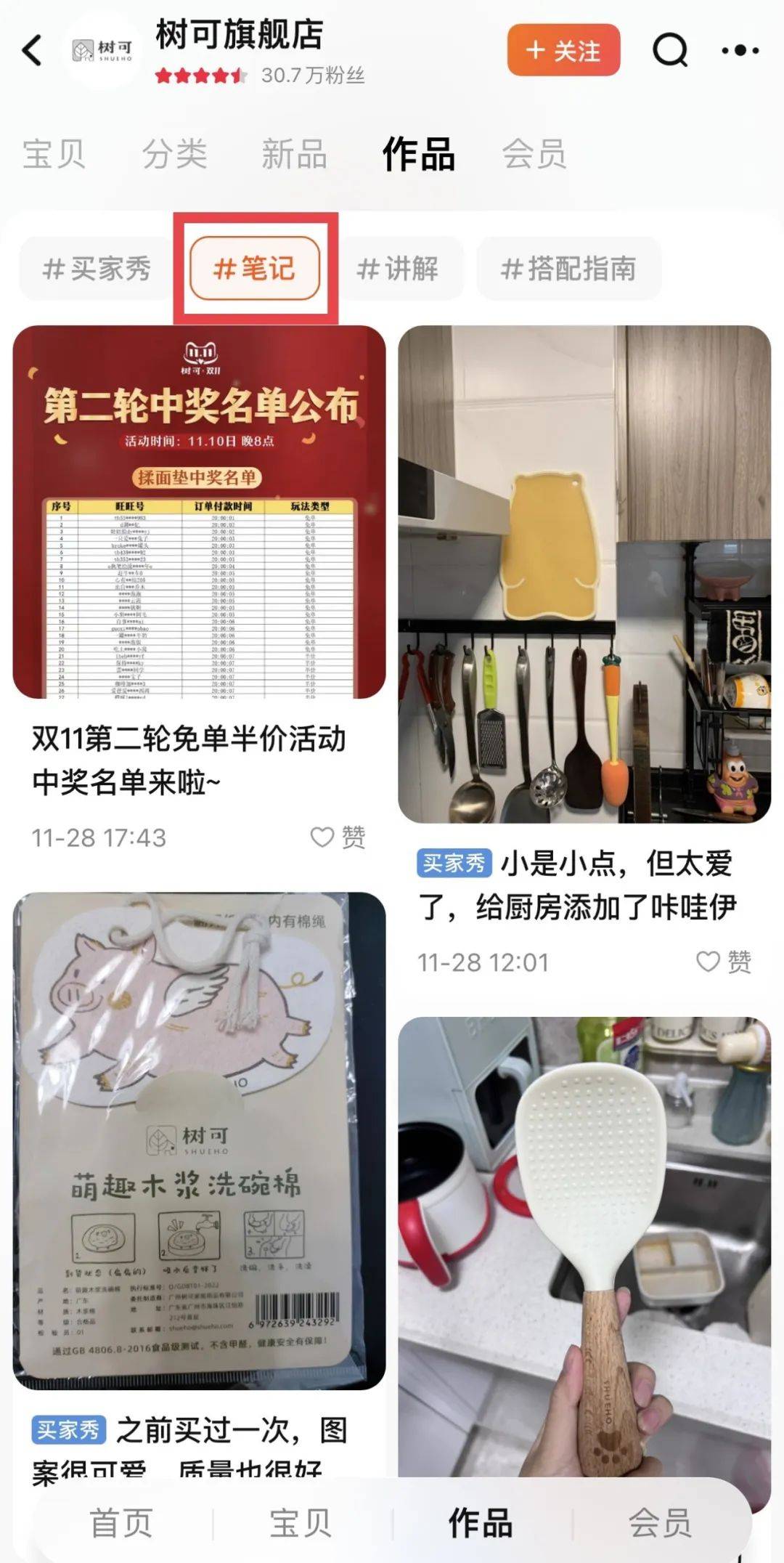 在淘宝推荐页面将以双列流的形式展示商家发布的视频内容动态, 直接跳转到商家店铺界面。在店铺的界面显示中,作品一栏被进一步划分为了以种草类视频为主的“笔记”,以及商家直播讲解和达人直播推荐内容。此外,商家可以根据自身需求个性化生成相关标签和页面展示。