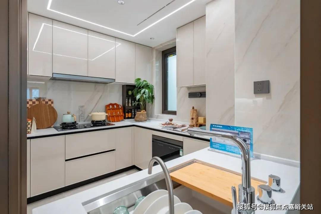 小厨房+单开门冰箱是标配。对于一生爱囤货的中国人来说,如此格局只能说“需要忍受”。为此,招商序设计了一面S墙,可以放下一个超大的双开门冰箱。