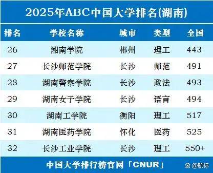 2025年ABC中国大学排名近日公布,湖南省高校整体实力稳步提升,多所院校在师资建设、学科布局及科技成果转化上取得突破。其中,中南大学以全国第25名的成绩蝉联省内榜首,湖南工业大学位列全国第266名,而湖南科技学院则以显著进步超越多所同类型院校,凸显湖南高等教育的多元化发展态势。这一排名结果,既反映了湖南高校在科研创新与人才培养上的持续投入,也揭示了区域教育格局的动态变化。